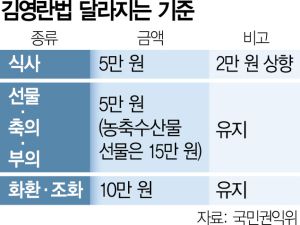 올해로 시행 8년 차를 맞은 청탁금지법은 식사비 3만 원, 화환·조화 10만 원, 선물 5만 원(농축수산물 선물가액은 15만 원)으로 한도가 정해져 있다. 불공정 관행을 개선하는 데 기여했다는 평가와 함께 과도한 규제로 민생 활력을 떨어뜨렸다는 비판을 끊임없이 받아왔다.