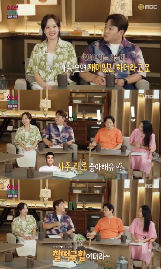 이날 박지민은 '타로 부부'를 만나보기 전 MC들에게 질문을 던졌다. 박지민은 "사주와 타로를 좋아하시냐"고 궁금해했고, 소유진은 "같이 사시는 분(백종원)이 그런 걸 좋아하시더라"고 말하면서 웃었다.
