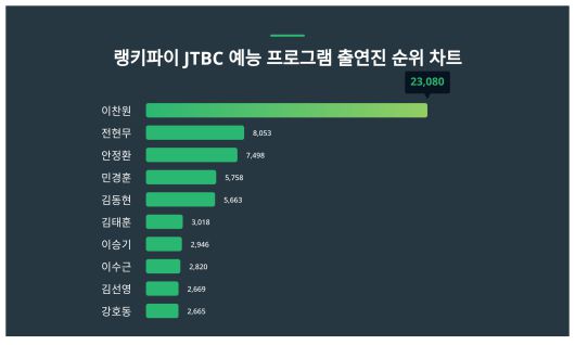 순위 키워드 트렌드지수 남성 여성 1 이찬원 23,080 11% 89% 2 전현무 8,053 42% 58% 3 안정환 7,498 60% 40% 4 민경훈 5,758 41% 59% 5 김동현 5,663 51% 49% 6 김태훈 3,018 60% 40% 7 이승기 2,946 39% 61% 8 이수근 2,820 57% 43% 9 김선영 2,669 52% 48% 10 강호동 2,665 64% 36% JTBC 예능 프로그램 출연진 트렌드 지수 분석 결과 ⓒ랭키파이
