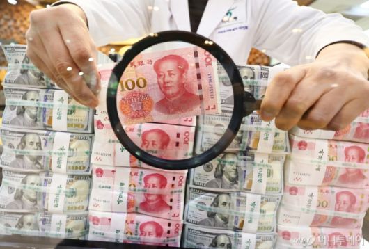 12일 서울 중구 하나은행 위변조대응센터에서 직원이 위안화를 들어 보이고 있다. /사진=뉴시스 |