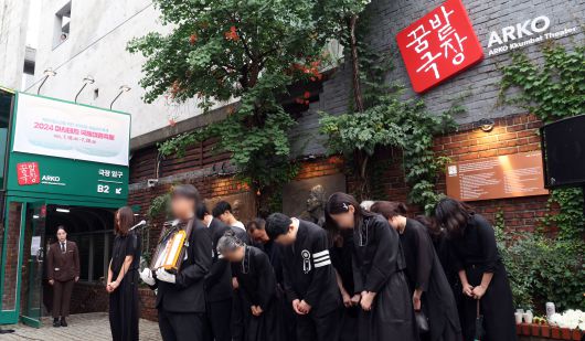 24일 서울 종로구 대학로 아르코 꿈밭극장(옛 학전)에서 열린 고 김민기의 노제에서 유족들이 인사를 하고 있다. / 뉴스1 |
