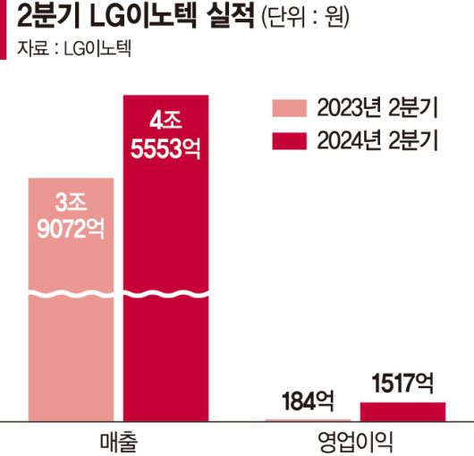 LG이노텍은 24일 2024년 2·4분기 한국채택 국제회계기준(K-IFRS) 매출 4조5553억원, 영업이익 1517억원을 기록했다고 공시했다. 이는 전년 동기 대비 매출은 16.6%, 영업이익은 726.2% 증가한 수치다.