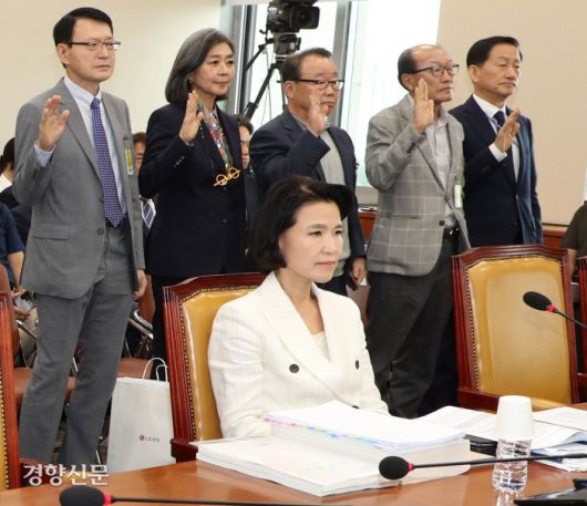 이진숙 뒤로 증인선서하는 김재철·류희림 24일 국회 과학기술정보방송통신위원회에서 열린 이진숙 방송통신위원장 후보자의 인사청문회에서 류희림 방송통신심의위원장(오른쪽)과 김재철 전 MBC 사장(오른쪽에서 두번째) 등이 증인선서를 하고 있다. 박민규 선임기자 parkyu@kyunghyang.com |