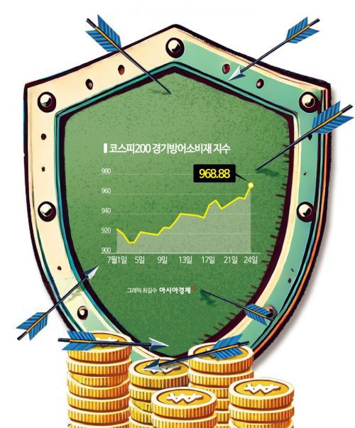 25일 한국거래소에 따르면 코스피200 경기방어소비재 지수를 추종하는 TIGER 경기방어 상장지수펀드(ETF)는 24일 종가 기준 이달 들어 6.17% 올랐다. 이 ETF는 셀트리온, 삼성바이오로직스, KT&G, KT, SK텔레콤, 한국전력, CJ제일제당 등 생활소비재, 건강관리 및 유틸리티 업종에 속하는 종목에 분산 투자한다. 최근 미국 대선, 경기 둔화 등 불확실성에 대비하기 위한 일부 투자 자금이 대외 변수 및 경기의 영향을 덜 받는 '경기방어주'로 이동한 것으로 보인다.