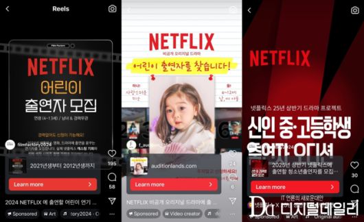 25일 <디지털데일리> 취재 결과 인스타그램, 페이스북, X(옛 트위터) 등 SNS상에서 넷플릭스 간판을 내건 아역배우 오디션 공고가 늘고 있다.