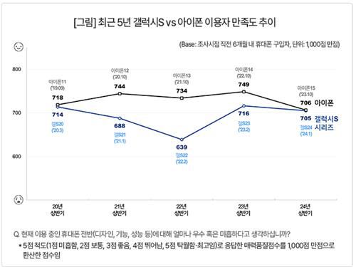 지난 5년간 추이에서 갤럭시S 시리즈는 2020년 714점으로 아이폰 718점을 4점 차로 따라붙었지만, 이후 2022년 S22 시리즈의 부진으로 그 차이가 95점으로 커졌다.