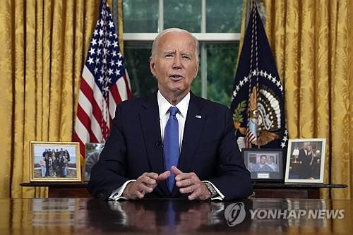 (워싱턴=연합뉴스) 조준형 특파원 = 조 바이든 미국 대통령은 24일 (현지시간) 자신의 재선 도전 포기에 대해 "새 세대에 횃불을 넘기는 것이 전진을 위한 최선의 길이라고 판단했다. 그것이 우리나라를 통합하는 최선의 길"이라고 밝혔다.