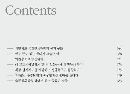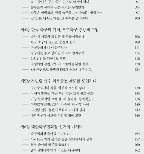 목차를 직접 살펴봤다. 크게 1부, 2부, 3부로 구성되어있으며 K리그 구단주로 활동하기 시작한 1994년 무렵부터 현재까지의 축구사를 빼곡하게 담아냈다. 본질적으로 기업 운영과 축구협회 운영을 엮어 바라보고 있는 시각이었다.
