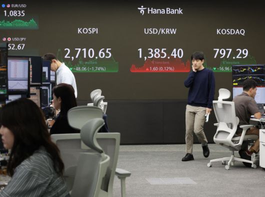 간밤 뉴욕 증시 폭락에 국내 증시는 2% 이상 하락했다. 외국인 투자자는 국내 증시에서 대규모 순매도하며 환율 상승을 지지했다. 외국인은 코스피 시장에서 6700억원대, 코스닥 시장에서 1300억원대를 팔았다.