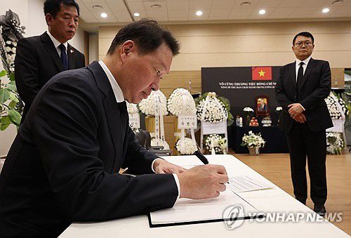 (서울=연합뉴스) 박동주 기자 = 최태원 대한상공회의소 회장(SK그룹 회장) 이 25일 서울 종로구 주한베트남대사관을 찾아 지난 19일 별세한 응우옌 푸 쫑 베트남 공산당 서기장을 조문하고 있다. 2024.7.25