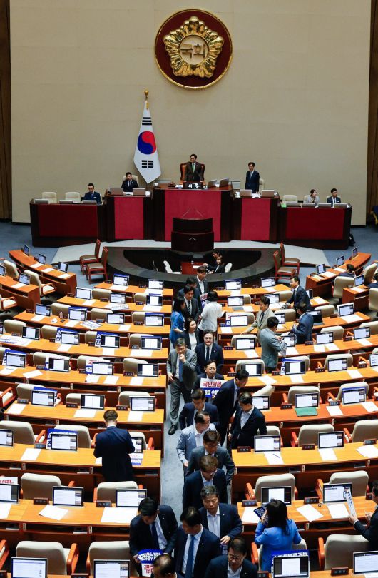 더불어민주당 의원들이 25일 오후 서울 여의도 국회에서 열린 제416회국회(임시회) 제1차 본회의에서 채해병 특검법 재표결(순직 해병 수사 방해 및 사건 은폐 등의 진상규명을 위한 특별검사의 임명 등에 관한 법률안 재의의 건) 결과 재석 의원 299명 중 찬성 194명, 반대 104명, 무효 1명으로 부결되자 퇴장하고 있다. 2024.7.25 (서울=뉴스1) |