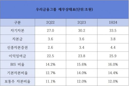 밸류업의 핵심인 총주주환원율은 보통주자본비율 12.5~13.0% 구간에서는 40%까지, 13.0% 초과 시에는 50%까지 확대하는 로드맵을 제시했다. 우리금융은 보통주자본비율 12.5%를 2025년까지 조기 달성하겠다고도 밝혔다. 올해 2분기 말에는 적극적 위험가중자산 관리 등으로 보통주자본비율 12.04%를 기록했다.