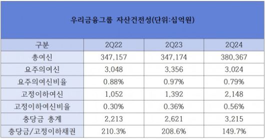 우리금융이 보유한 전체 고정이하여신(NPL) 비율은 2분기 말 기준 0.56%로, 1년 전(0.40%)보다 0.16%p 소폭 상승하는 데 그쳤다.