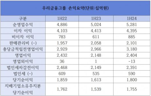 우리금융의 실적을 보면 비이자이익에서도 큰 개선을 이뤘다. 우리금융의 올해 상반기 이자이익은 4조3950억원을 기록하며 전년 동기 대비 0.4% 감소한 반면 비이자이익은 8850억원으로 같은 기간 45.1% 급증했다.