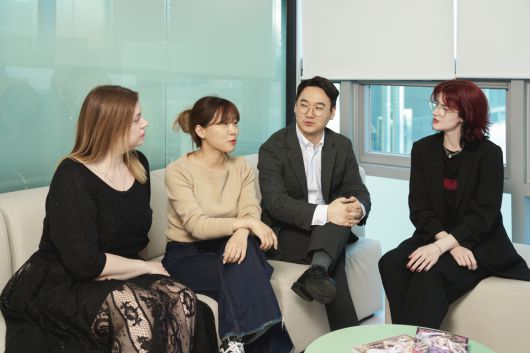 (왼쪽부터)클레어 가믈랭 프랑스어번역팀 팀장, 문승현 부대표, 박정진 대표, 마리사 럭키 영어번역팀 팀장이 본지와 인터뷰를 하고 있다. |