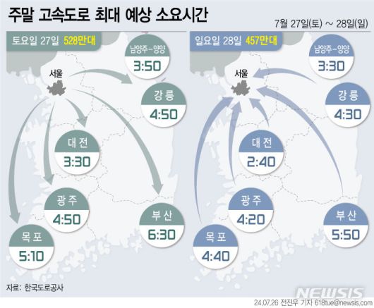 [서울=뉴시스]이연희 기자 = 여름 휴가철이 본격적으로 시작됨에 따라 7월 네 번째 주말 고속도로 교통량은 지난주보다 증가할 것으로 보인다.