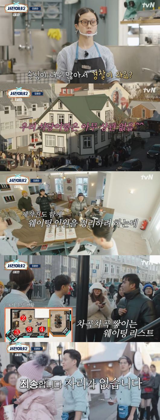이미 식당 밖은 손님들의 줄 서기가 시작됐고, 급기야 경찰차까지 출동했다. '서진이네2' 멤버들은 몰려든 인파 때문인 것으로 알고 당황했으나, 경찰은 교통 위반 차량을 단속 중이었던 것.