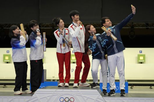 [샤토루=AP/뉴시스] 금지현과 박하준(왼쪽)이 27일(현지시각) 프랑스 샤토루 슈팅 센터에서 열린 2024 파리올림픽 사격 공기소총 10m 혼성 단체에서 은메달을 목에 걸고 시상대에 올라 중국, 카자흐스탄 선수들과 셀카를 찍고 있다. 금지현-박하준은 결선에서 중국의 황위팅-성리하오 조에 12-16으로 패해 은메달을 따 한국의 첫 메달 소식을 알렸다. 2024.07.27. /사진=뉴시스 |