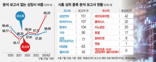 28일 금융정보 업체 에프앤가이드에 따르면 올들어 증권사 분석 보고서가 하나도 나오지 않은 코스닥 상장 기업 비중은 65.23%(1628개 중 1062개, 23일 기준)로 5년 새 최고치를 기록했다. 2020년부터 지난해까지는 ‘보고서 제로’ 기업 비중이 60%을 넘지 않았지만 올들어 급등했다.