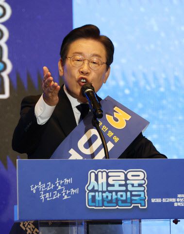 28일 오전 충북 청주 cjb 미디어센터에서 열린 더불어민주당 당 대표·최고위원 후보자 합동연설회에서 이재명 당 대표 후보가 정견을 발표하고 있다. (사진=연합뉴스) |