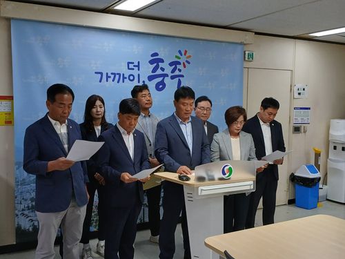 (충주=연합뉴스) 김형우 기자 = 충주시의회 국민의힘 소속 의원들이 29일 당내 경선 결과에 불복하고 야당의 도움을 받아 시의회 의장이 된 김낙우 의장의 사과와 사퇴를 요구하고 나섰다.