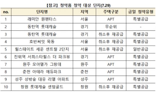 이날 청약 접수를 받은 단지는 총 10곳이다. 분양가 상한제를 적용받아 '로또 청약'이라 불리는 래미안 원펜타스 특별공급을 비롯해 수억원 가량 시세 차익을 누릴 수 있는 동탄역 롯데캐슬(무순위, 취소후 재공급) 호반써밋 목동, 힐스테이트 세운 센트럴 2단지, 창원 롯데캐슬 센텀골드 취소후 재공급분 청약 접수가 진행중이다. 이밖에 ▲진위역 서희스타힐스 더 파크뷰 ▲원주 모아엘가 그랑데 ▲춘천 아테라 에듀파크 ▲성주 성밖숲 대유 리엘아파트도 특별공급 청약 접수를 받는다.