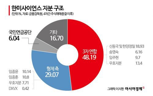 이번 임시주총 소집은 절반에 가까운 우호 지분을 확보한 3자 연합이 본격적인 경영권 탈환에 나선 것으로 풀이된다. 이들은 지난 3일 전격적인 3자 연합 결성을 통해 48.19%의 지분을 끌어모았지만 그룹 지주사인 한미사이언스의 경영권을 틀어쥐진 못했다. 현재 한미사이언스 이사회 구성상 연합 측 4명, 형제 측 5명으로 연합 측이 열세에 눌려있기 때문이다. 게다가 임종훈 한미사이언스 대표가 송영숙 회장을 축출하고 단독대표 체제를 구축하며 경영권을 홀로 장악한 상황이다.