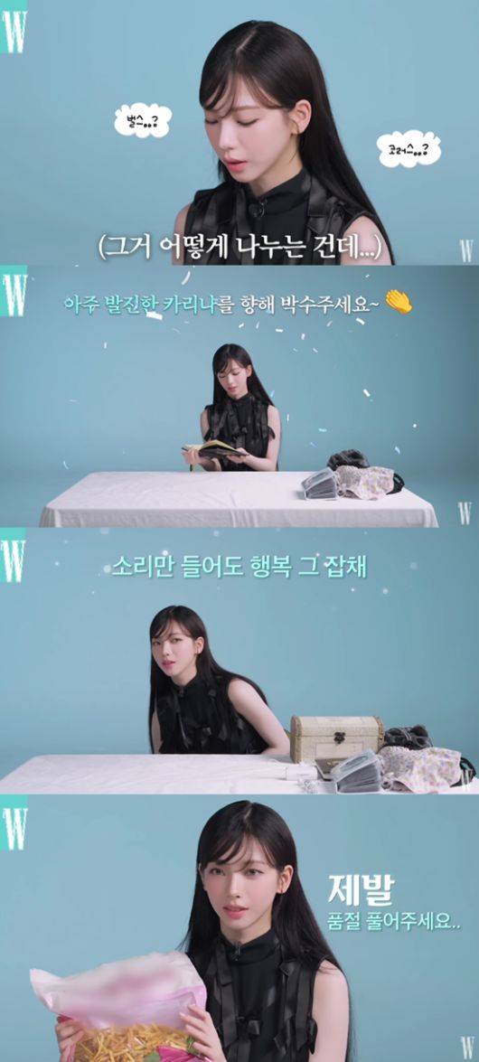 이어 카리나는 "정말 소개해 주고 싶은 애장품이다. 소리만 들어도 행복하다. 놀라지 말아달라"며 웃은 뒤 대용량 고구마스틱을 꺼냈다.