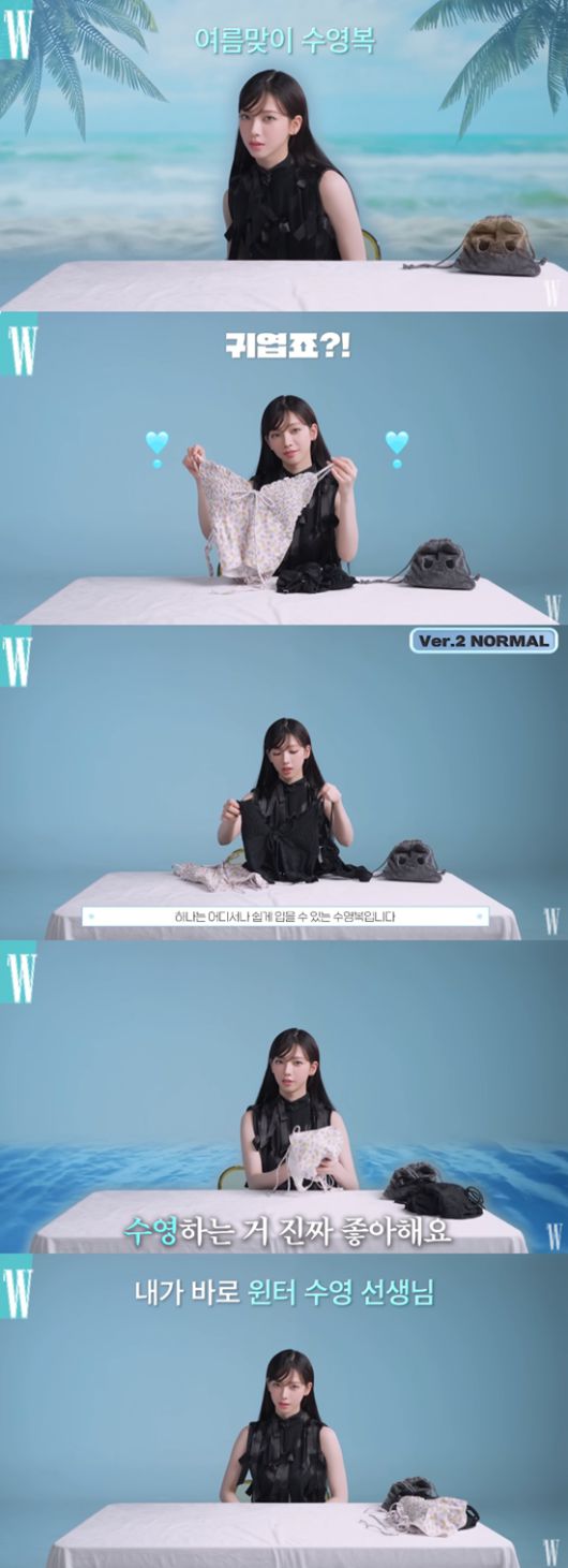 그는 "어떤 취향이실지 몰라서 두 개를 담아왔는데 하나는 귀여운 수영복이고 하나는 어디서나 쉽게 입을 수 있는 수영복"이라고 설명했다.