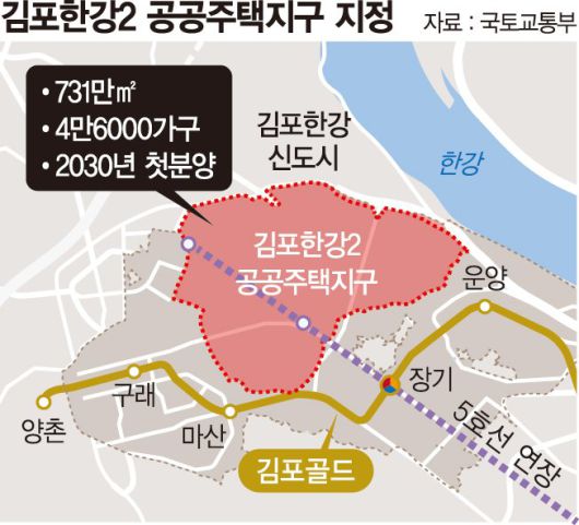 김포한강2지구 인근에는 김포한강신도시 1086만㎡(5만6000가구)를 비롯해 김포장기지구 88만㎡(5000가구), 김포양곡지구 84만㎡(5000가구), 김포감정1지구 34만㎡(4000가구) 등 4개 개발사업이 추진 중이다. 김포한강2지구까지 포함하면 총면적은 2023만㎡, 가구수는 11만6000가구로 늘어난다.