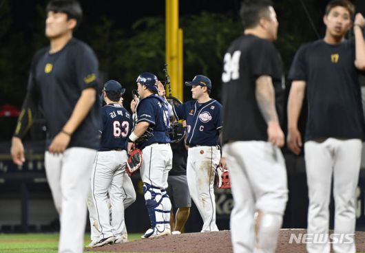 [광주=뉴시스] 박기웅 기자 = 30일 오후 광주 북구 광주-기아챔피언스필드에서 열린 2024 신한 SOL뱅크 KBO리그 KIA 타이거즈 대 두산 베어스의 경기, 12대 7로 승리한 두산 선수단이 기뻐하고 있다. 2024.07.30. pboxer@newsis.com