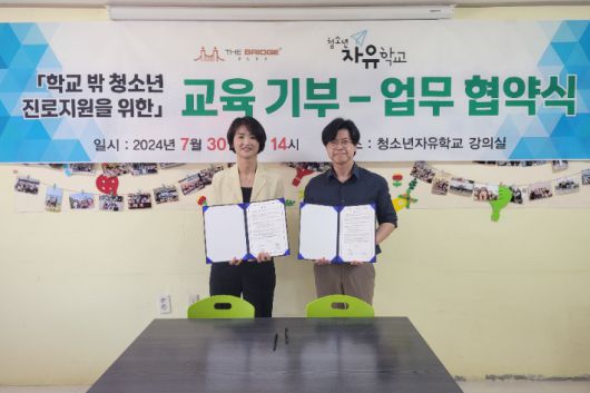 더브릿지플러스와 청소년자유학교는 7월 30일 청소년자유학교에서 '학교 밖 청소년의 진로지원을 위한 교육기부 업무협약'을 맺었다.