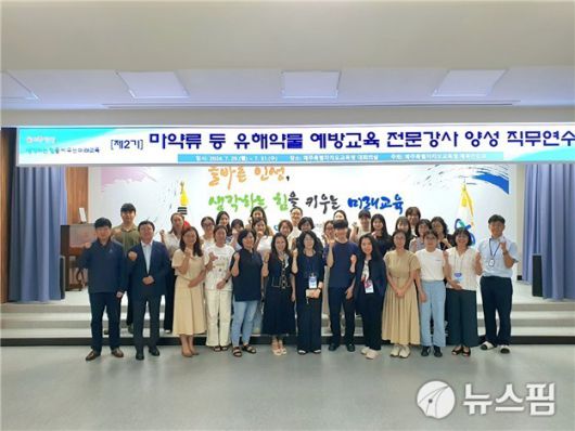 제주도교육청은 지난 29일부터 7월 31까지 3일간 도교육청 대회의실에서 교원 등이 [제2기] 마약류 등 유해약물 예방교육 전문강사 양성 직무연수를 마치고 기념촬영을 하고 있다.[사진=제주교육청] 2024.07.31 mmspress@newspim.com |