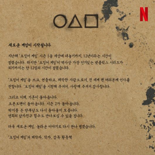 이날 오징어게임 시리즈를 연출한 황동혁 감독은 편지를 통해 후속 시즌을 공개하는 소감을 전했다. 황 감독은 "진짜 게임이 시작됩니다"라며 "여러분께 시즌2의 공개 일정과 시즌3 제작 소식까지 알리는 편지를 쓸 수 있게 되어 너무나 기쁘고 설렙니다”라고 운을 뗐다.
