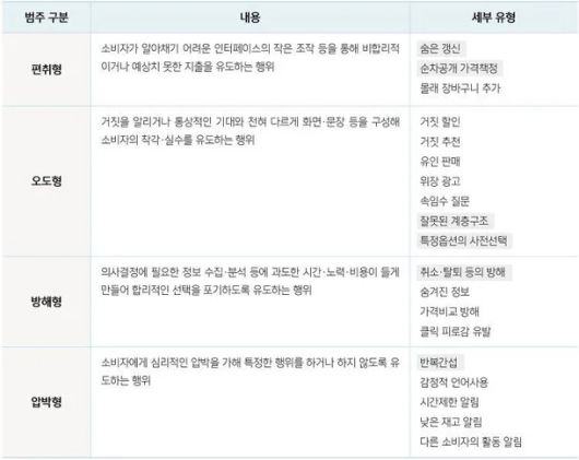 공정거래위원회는 다크패턴을 크게 ▲편취형 ▲오도형 ▲방해형 ▲압박형 등 4가지 범주로 구분하고, 이를 19가지 세부 유형으로 명시했다. 이는 법령이 마련되기 전에 업체가 자발적으로 개선하라는 취지에서다.