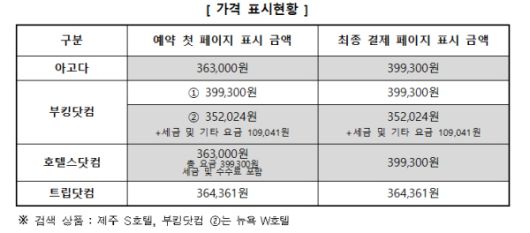 한국소비자원이 지난해 공개한 OTA 상위 5개 업체의 판매가격 표시 현황에 따르면, 이들 중 4개 업체가 숙박 예약 첫 페이지에 세금·수수료를 제외한 금액만 표시하거나, 추가 요금 또는 최종 결제 금액을 작은 글씨로 표기한 것으로 드러났다.