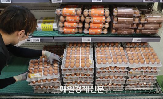 서울의 한 대형마트에서 직원이 매대에 계란을 채우고 있다. [이승환 기자] |