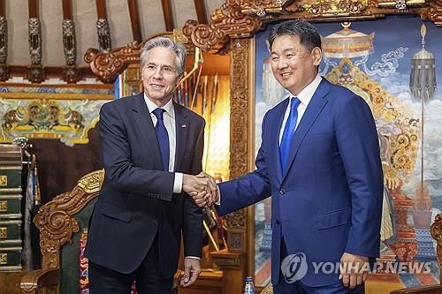 AFP통신에 따르면 블링컨 장관은 이날 몽골 수도 울란바토르에서 바트뭉흐 바트체첵 몽골 외교장관과 양자회담을 개최하고 오흐나 후렐수흐 대통령, 롭상남스라이 어용에르덴 총리와 면담했다.
