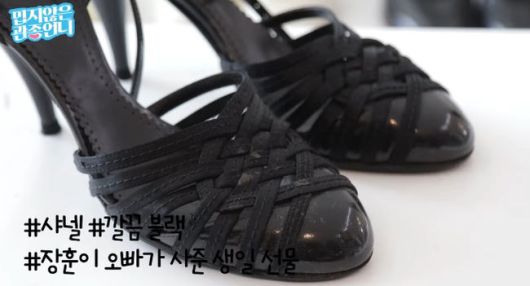 그러던 중 "옛날 샤넬거 보여주겠다. 서장훈 오빠가 친하지 않냐. 생일때 생일선물로 받은거다"라며 서장훈에 선물받은 명품 구두를 공개했다. 그는 "이런 신발 단점은 뺐다 꼈다 이게 너무 불편하다. 버클도 샤넬 로고로 돼있다. 패턴이 강력하긴 한데 예쁘죠?"라고 자랑했다.