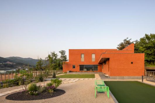 1층 정문으로 들어가 그늘진 계단을 오르면 넓은 마당이 펼쳐지고 나지막이 자리 잡은 붉은 벽돌 건물이 보인다. 두 개의 큰 덩어리가 'ㄱ' 자 모양으로 연결됐는데 마당에서는 정면에 주방과 다이닝룸이 있는 2층 건물이, 그 옆으로는 부부가 사용하는 안방과 욕실이 배치됐다. 건물과 마당 사이에는 낮은 단을 둬 건물의 수평선이 편안한 느낌으로 흐른다. 벽돌 건물은 쌓기 방식을 다르게 해 곳곳에 변주를 줬지만 이 역시 담담한 톤 앤 매너다. "가장 좋은 집은 편안한 집"이라는 이 소장의 신념이 반영된 결과다. 이어지는 이 소장의 설명. "콘크리트조의 현대 주택이면서도 한옥의 무드가 느껴지는 것이 포인트예요. 이 집의 단초인 편안한 분위기가 한국인의 세포에 새겨진 오랜 기억, 경험과 연결될 수 있었으면 했죠."