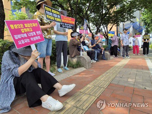 (대구=연합뉴스) 박세진 기자 = 2일 오전 대구 수성구청 앞에서 범어공원풀비체 소규모 재건축 조합원들이 시공사를 상대로 공사 중단 등 문제 해결을 촉구하며 집회를 벌이고 있다. 2024.8.2