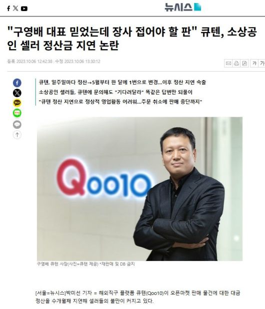 (뉴시스 2023년 10월 6일자 "구영배 대표 믿었는데 장사 접어야 할 판" 큐텐, 소상공인 셀러 정산금 지연 논란 기사 참조)