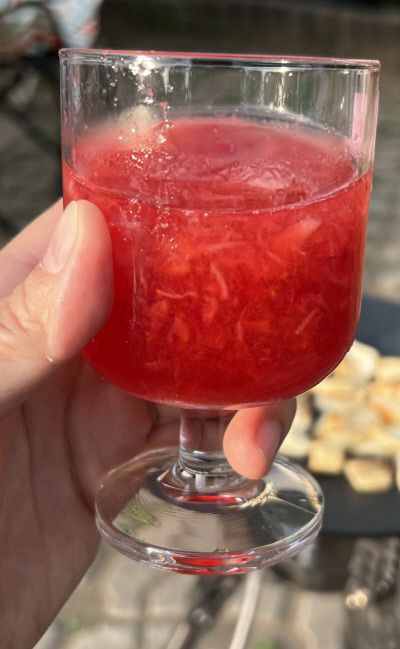 잔을 식혔다면 아무 그릇에나 캠핑에 가져와서 남은 과일을 넣고 으깬다. 질긴 껍질이나 씨앗은 제거하고, 분량은 딸기를 기준으로 1잔당 1.5개가 적당하지만 입맛에 따라 가감하면 된다. 그리고 셰이커에 얼음과 과일, 과일에 어울리는 시럽 4분의 1온스, 설탕 2작은술, 럼 1온스를 넣는다. 시럽이 없다면 설탕량을 입맛에 따라 늘리고, 럼도 주량에 따라 가감할 수 있다. 개인적으로 나를 위해 만들 때는 2분의 1온스에서 4분의 3온스 사이를 넣는 편이다.