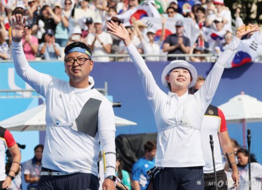 [파리=뉴시스] 김진아 기자 = 김우진-임시현이 2일(현지시각) 프랑스 파리 레쟁발리드에서 열린 2024 파리 올림픽 양궁 혼성 단체 결승 독일과의 경기에서 승리하며 금메달을 확정한 뒤 기뻐하고 있다. 2024.08.03. bluesoda@newsis.com /사진=김진아 |
