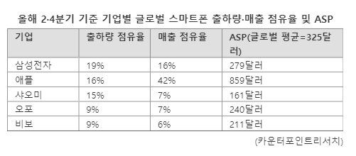 같은 기간 애플의 ASP는 859달러(약 116만원)인 반면, 삼성전자의 ASP는 279달러(약 38만원)으로 글로벌 평균 ASP(325달러)보다도 낮은 수준이다. 중국 기업의 ASP와 격차도 크지 않다.