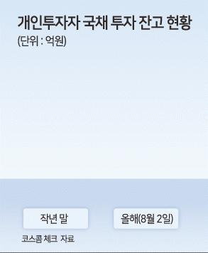 5일 금융정보업체 코스콤 체크에 따르면, 2일 기준 개인들이 보유한 국채 잔고는 22조1270억원으로 역대 최고치를 기록한 것으로 나타났다. 이는 2001년 관련 통계가 집계된 이후 사상 최고 수준이다. 작년 말(14조9127억원)보다 약 7조2100억원이 늘었다. 채권개미의 국채 투자 잔고는 지난 5월 21조원대까지 불어났다가 6월 들어 20조원대로 줄기도 했다. 하지만 커지는 금리 인하 기대감에 힘입어 지난달 29일(22조200억원) 22조원을 처음으로 돌파했다. 개인은 올 들어서만 국채 9조1078억원어치를 순매수했다.