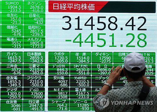 닛케이지수는 이날 직전 거래일보다 12.4%나 하락한 31,458에 장을 마감했다. 오후 장 중 한때는 31,156까지 떨어지기도 했다.