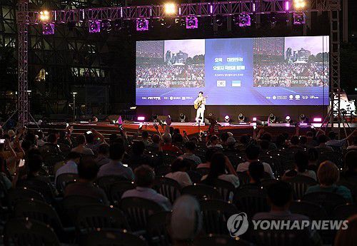 (서울=연합뉴스) 김성민 기자 = 열대야가 기승을 부리고 있는 5일 오후 시민들이 중구 서울광장에서 열린 '우크라이나 청년들의 감사 콘서트'를 지켜보고 있다. 2024.8.5