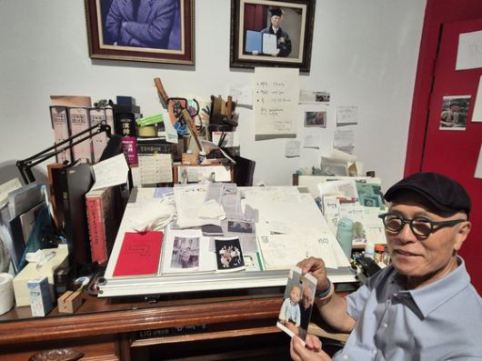 전남도립미술관 전시장에 재현한 작업실에 허영만이 앉았다. 광양=권근영 기자 |