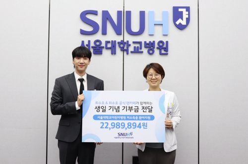 ▲ 트로트 가수 최수호가 지난달 31일 공식 팬클럽 '수방사'와 함께 서울대학교어린이병원에 기부금 2천298만9천894원을 전달했다고 소속사 포고엔터테인먼트가 6일 밝혔다. 최수호의 생일을 기념해 팬클럽과 가수가 마련한 기부금은 사회 취약계층 소아 환자들의 치료비로 사용될 예정이다. 최수호는 TV조선 '미스터트롯 2'에 출연한 가수로 현재 방송과 공연으로 활동하고 있다. (서울=연합뉴스)